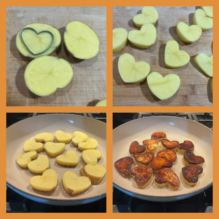 Cut the potatoes in slices as thick as your cookie cutter. Use the cookie cutter to get heart shapes, as many as you want and will fit an oven-safe skillet in one single layer. Place the slices of potato in a bowl with the warm water and salt for 2 to 6 hours.