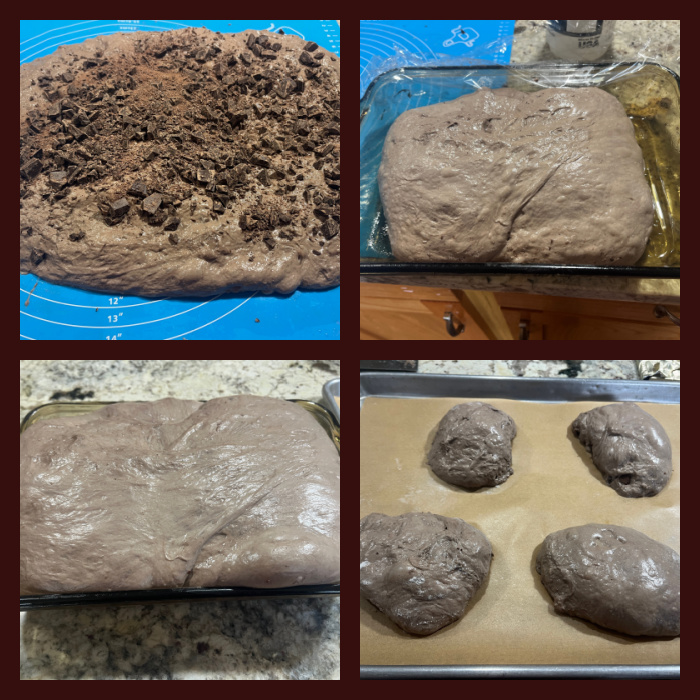 Gently turn the dough out onto a heavily floured surface. Sprinkle a generous amount of flour on top of the dough and roll the cut sides of the dough on the floured surface so no sticky spots are exposed. Tuck any visible pieces of chocolate into the dough to prevent them from burning.