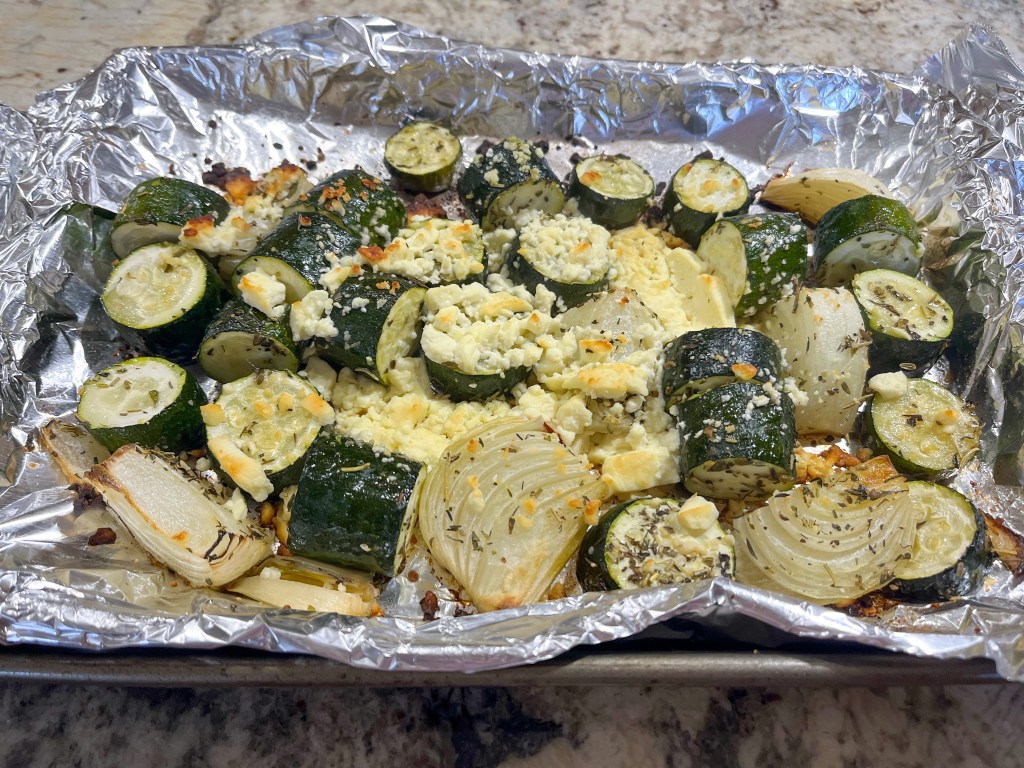 Combine zucchini, onion, Herbes de Provence, salt and pepper on a quarter sheet baking dish covered with aluminum foil. Drizzle olive oil and place in the oven for 30 to 35 minutes. Ten minutes into the roasting, scatter the feta crumbles on top and drizzle a little more olive oil over the pieces. Keep roasting for another 15 minutes or longer, until the feta pieces start to get caramelized.