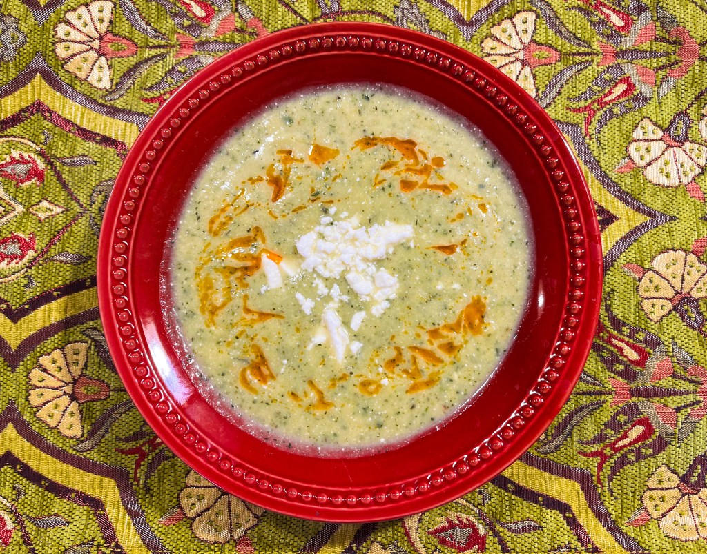 Transfer vegetables and cheese to the blender; add broth (use less for a thicker soup) and blend until smooth. Use caution while blending hot liquids! Warm the soup on the stove ladle into bowls; garnish with extra feta and drizzle chili oil if so desired.