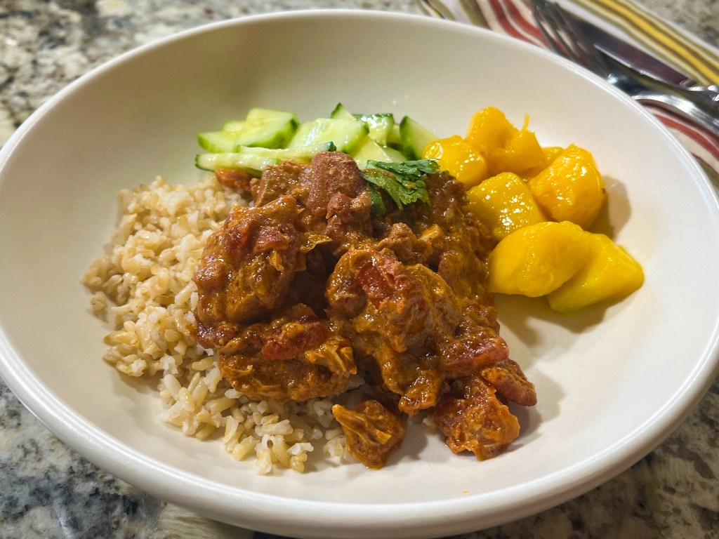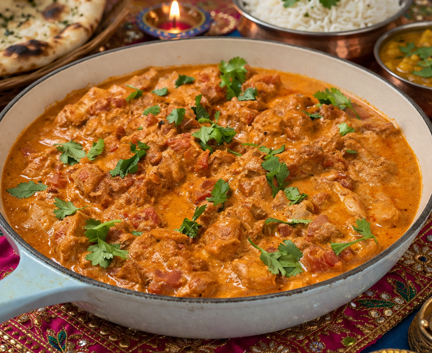 Add the marinated chicken (with any yogurt marinade), stirring until everything is well mixed. Cover and bake for 2 and a half hours, covered. Open the pan, stir the pieces around and drizzle the heavy cream all over. Cook uncovered for 20 to 30 more minutes, depending on how much sauce you like, if you prefer a drier texture, cook it longer to evaporate more liquid. Serve with fresh cilantro sprinkled on top.