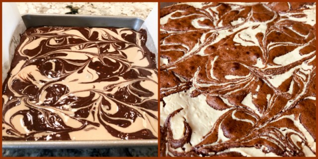 Spread the chocolate batter evenly in the bottom of the prepared pan. Using a tablespoon, drop dollops of the pumpkin batter all over the top. Using chopsticks, wirl the pumpkin batter slightly into the chocolate. Bake for 25 to 30 minutes until a toothpick inserted into the center comes out clean. Let the brownies cool completely, then cut into squares.