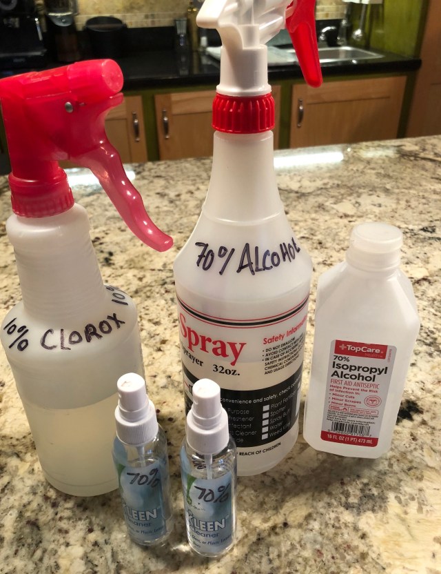 1. Prepare disinfectants.Coronaviruses are microscopic particles, invisible to the naked eye, that have an RNA genome within a lipid bilayer membrane that also contains proteins. The membrane makes the virus hardy and protects it outside the host cell. However, most viruses, including COVID‐19, are susceptible to destruction by bleach or alcohol. The first thing to do at home is to prepare two types of spray bottles, one containing 10% bleach, and one containing 70% alcohol (either isopropanol or ethyl alcohol). If you are not knowledgeable about making such solutions, here’s how to do it. For the bleach solution, mix 1 part CLOROX with 9 parts water. Do not use cheap, off brands of bleach; CHLOROX contains stabilizers that maintain its potency for up to 5 days after dilution in water. Ordinary bleach loses efficacy within 1 day of dilution in water. For the 70% alcohol, you can buy bottles of 70% isopropanol in supermarkets or pharmacies. You can also buy EVERCLEAR (it is 95% ethyl alcohol) in a liquor store, and mix 3 parts EVERCLEAR with 1 part water. Isopropanol is also available as a 95% solution, so you can dilute that the same way. 10% bleach, 70% isopropanol or 70% ethyl alcohol inactivate and kill COVID‐19 within a minute of exposure. Put these solutions in 1 qt spray bottles (available at supermarkets, pharmacies and hardware stores) for general use. We also prepare small, 60 mL spray bottles of 70% alcohol to carry in a pocket or purse, and use them to spray down anything that we suspect might be contaminated, including our hands, shopping cart handles, door knobs, gas pump dispensers, etc. You can find these small spray bottles in pharmacies or eye centers, because they are often used to hold eyeglass cleaning solution. Don’t skimp when decontaminating something with bleach or alcohol: give it a thorough coating, until it’s wet with the liquid, then let it sit for at least a minute.