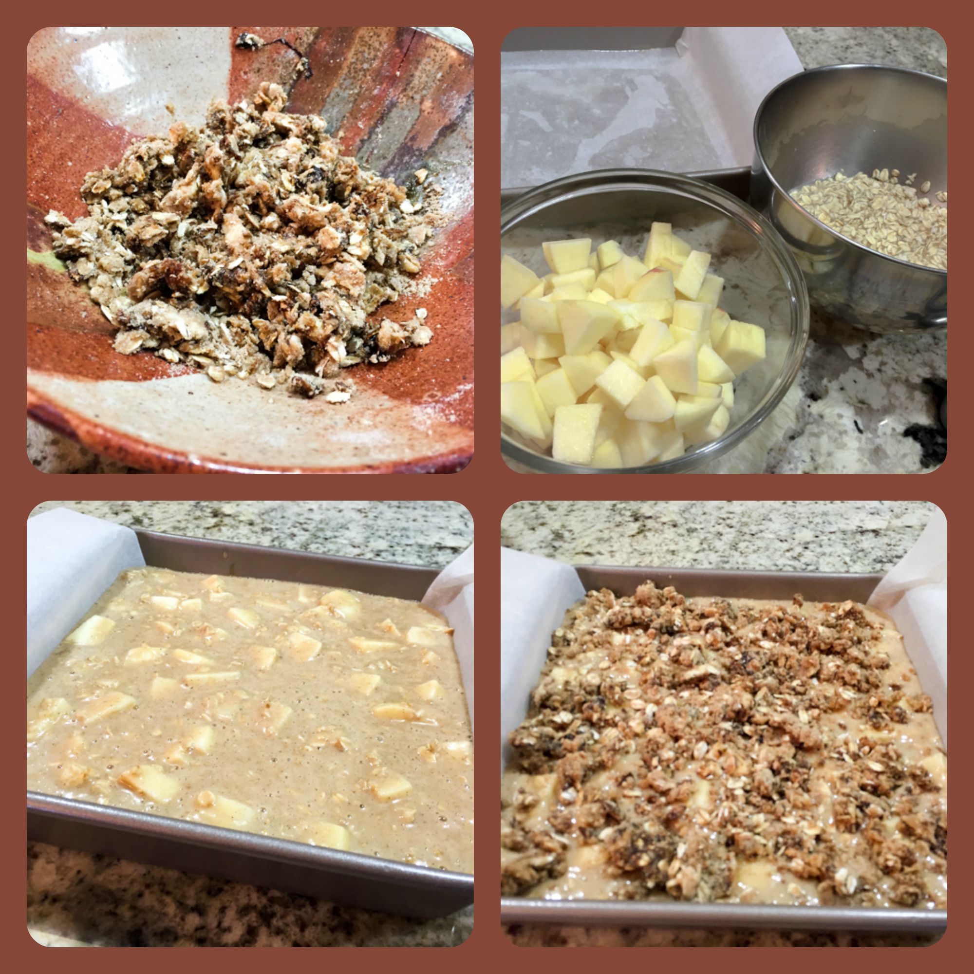 In another bowl, whisk the oil, both sugars and eggs until thoroughly blended. Add in the vanilla and oat and apple juice mixture. Mix in the dry ingredients in 3 additions, alternating with half the milk and beginning and ending with the dry ingredients. Mix just until there are no dry streaks of flour. Fold in the chopped apples. Pour the batter into the prepared pan and spread it out in an even layer. Sprinkle the streusel evenly over the top of the batter.