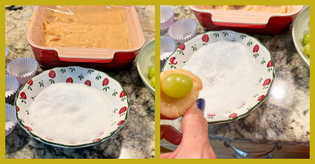 Remove from heat, transfer to a small baking dish to cool faster. Place in the fridge if you like to speed up the cooling process. Once at room temperature, grab small amounts with a spoon, spread on the palm of your hand and place a grape in the center. Carefully roll the mixture around (wet hands help), enclosing the grape. Roll on sanding sugar. Decorate with a sprinkle, if so desired.