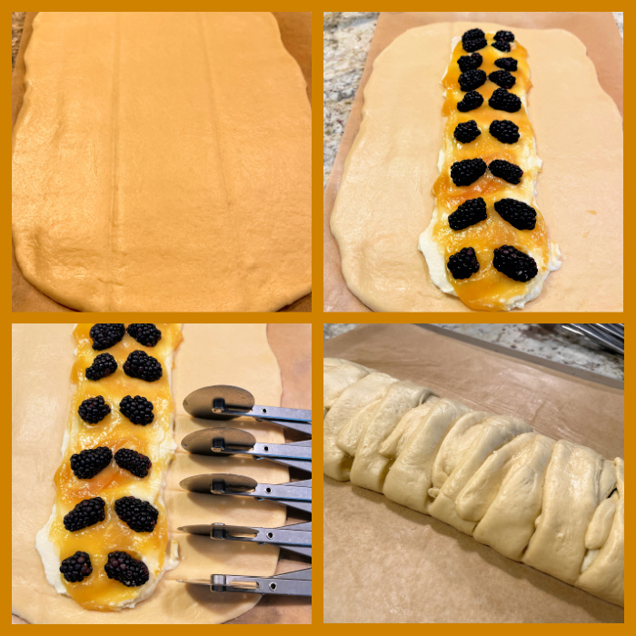 To shape the rolls: grab 60g portions of the dough, still cold from the fridge and roll as a rectangle so that the shorter dimension will fit in your baking pan of choice. Cut small strands on 3/4 of the length as shown in the pictures below. Add the filling to the top and roll it to close. Place in your baking pan and let it rise covered loosely for 1 hour to 90 minutes. Brush the surface with the egg yolk reserved, and bake at 375F for 20 to 25 minutes, until golden brown.