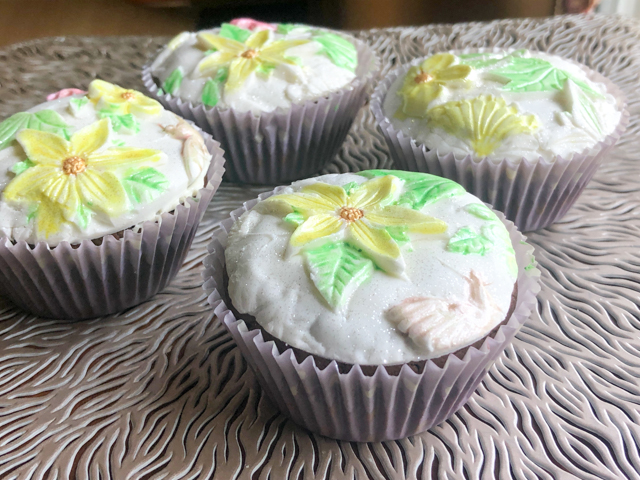 Not too long ago I shared a series of brownie cupcakes with a light milk glaze that you can take in many different directions depending on what you use to flavor the milk. In this post the same simple cupcakes were topped with fondant textured with a silicone mat. You will need a very small amount of buttercream spread on the top to serve as a glue for the fondant. I had some leftover from macarons, but you need so little that I would not mind if you grabbed a store-bought version. Perhaps a Wilton cream cheese frosting, which is not too sweet. It won’t be as good as home-made, but you will barely taste it in this case. Recipe for the cupcakes found here.