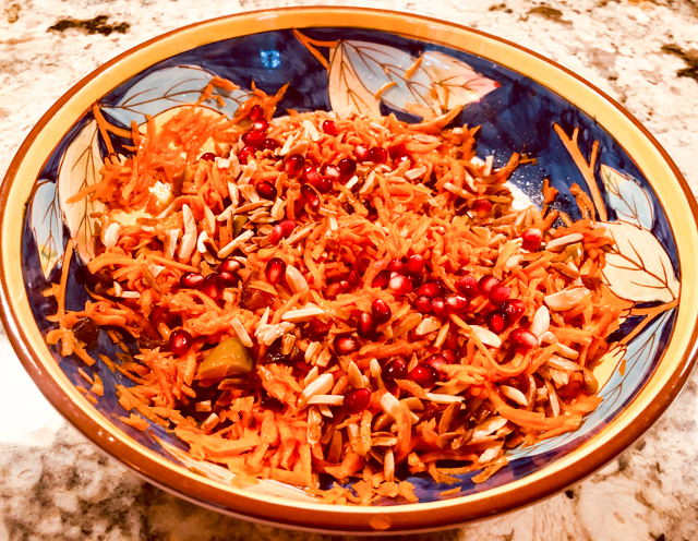 I don’t know about you, but at this time of the year, when I just about had it with the weather, a platter of colorful food lifts my mood. Pickled carrots will be here to stay. I’ve been keeping a small jar in the fridge for my own pleasure. It seems to go well with lots of main dishes, and the texture only gets better with time. Make sure to shave them thin, and probably best to avoid that central harder core. Just turn the carrot around and start from the other side.