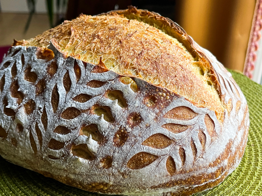 Comments: I really love the way the bread opens up with the second slashing once the dough has been in the oven for 5 to 7 minutes, not longer. It is a bit tricky to open the pan and do the second scoring, but totally worth it. Just be careful not to burn yourself. I’ve seen this tip on several IG posts and I am quite fond of it now. Whenever you want to coach your bread to open in a specific spot to preserve your design, think about incorporating this step in your baking.