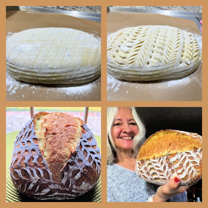 Invert the dough on a piece of parchment paper and score with a pattern with a new razor blade.