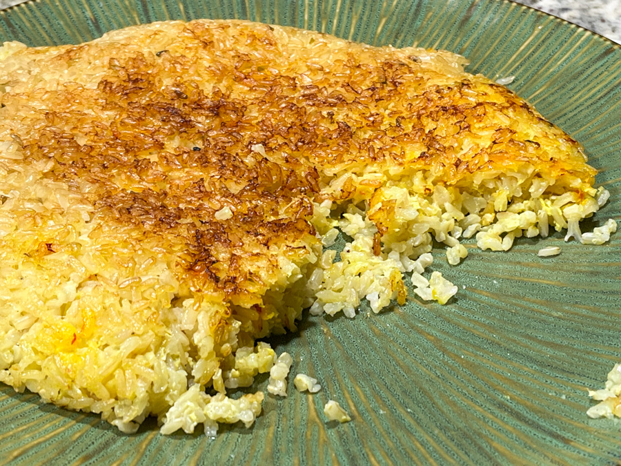 Place on a low-burner for exactly 30 minutes. At the end of 30 minutes check to see if the bottom is golden, if not, increase the heat lightly and remove the lid. Leave it for a minute or two, should be enough to make a nice crust at the bottom. Carefully place a platter on top and invert the rice on it. Cut in wedges to serve.