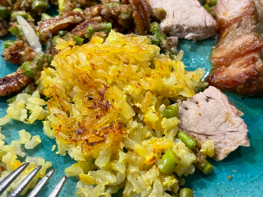 . QUICK BROWN RICE TAHDIG WITH HAWAIJ SPICE (from the Bewitching Kitchen)