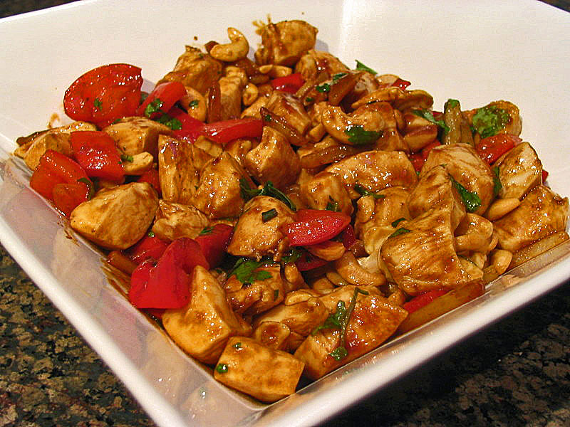 Add the chicken slices previously cooked, move the pieces around to warm them through. Add the reserved sauce, and simmer everything together until the sauce is slightly thickened. Squirt some lemon juice right before serving, and sprinkle with sesame seeds, if so desired.