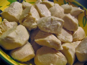 Place the chicken breast rubbed with the olive oil and seasoned with ginger and salt inside a food-safe plastic bag. No need to seal with vacuum, but you can if you prefer. Place chicken in sous-vide at 150F and cook for 3 to 4 hours. Time is flexible, you can leave it longer if needed, but don’t let it go past 6 hours at that temperature.