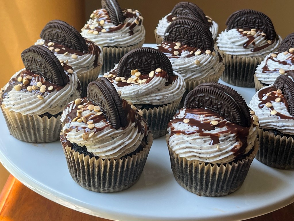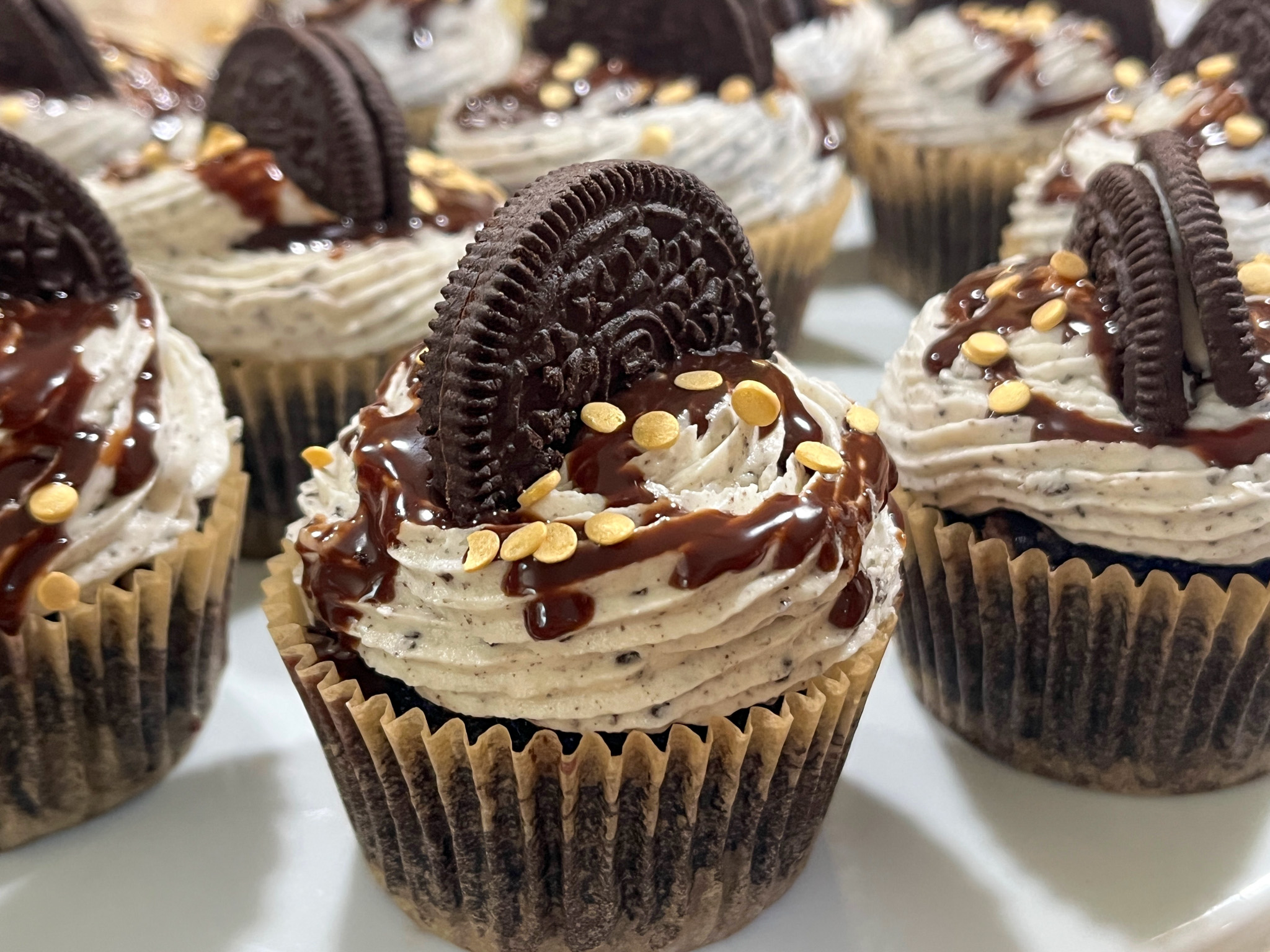 Make the buttercream. Whip the softened butter for 5 minutes with a paddle attachment. Add the powdered sugar, vanilla and salt and mix until incorporated, in low-speed. Add the heavy cream to adjust consistency, then the crumbs of Oreos. Mix at medium-high for a minute or so until smooth. Frost the fully cool cupcakes. Place in the fridge for 15 minutes to set. Then add the drizzle, and a half of Oreo on top. Sprinkles are optional.
