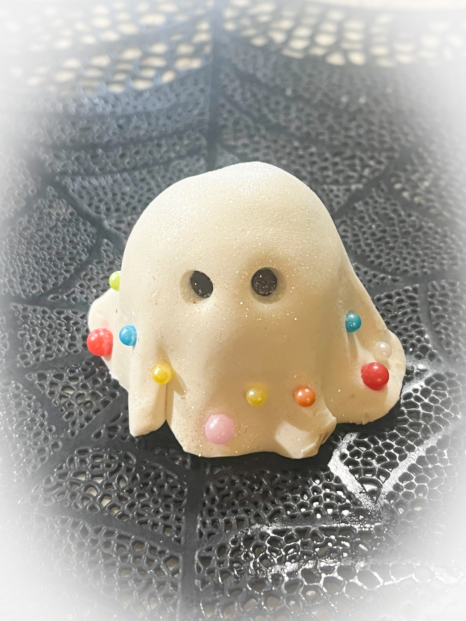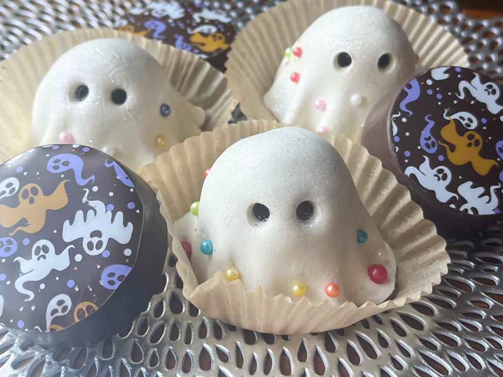 These turned out so cool, I was super happy with them. My sister Norma pointed out they reminded her of Leonardo da Vinci’s inventions, so that’s the reason for the name. I used a silicone mold I’ve had for many years to make the decorations with dark compound chocolate, later brushed with luster powder copper. I used a very light green to tint the chocolate for the molds.