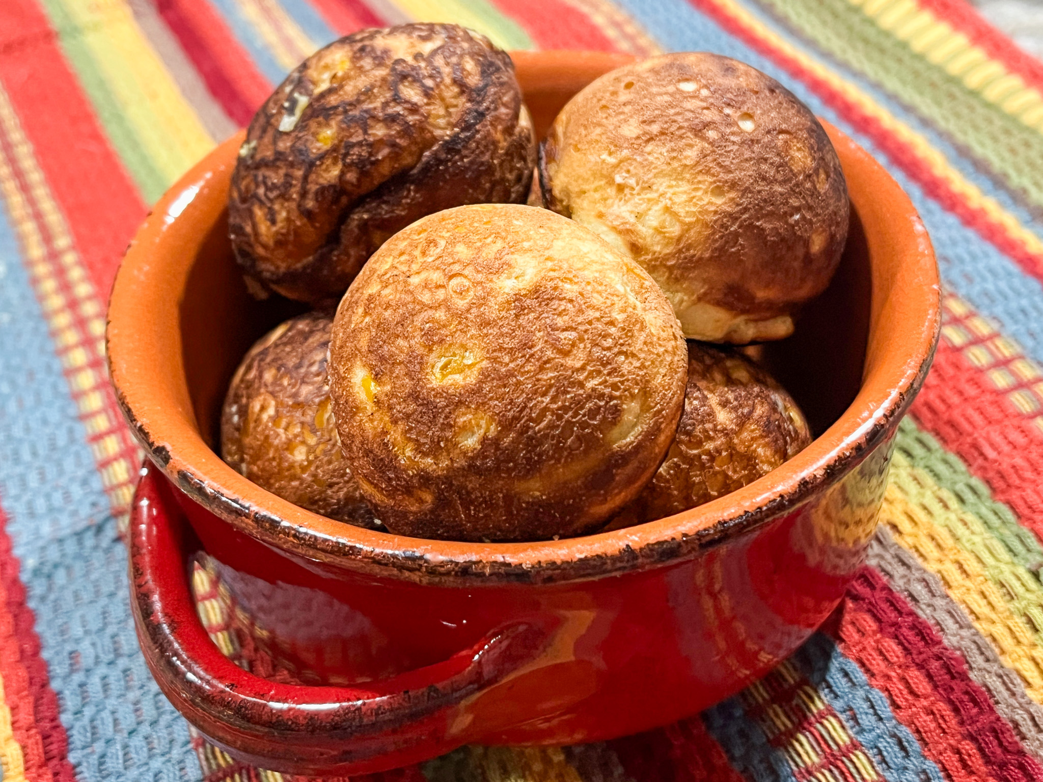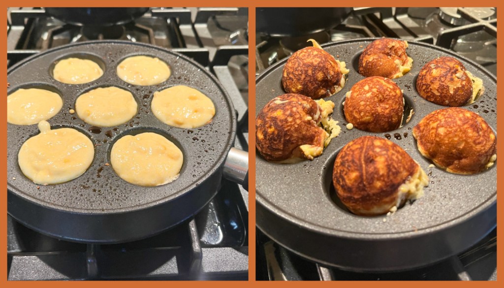 After that, add a little more batter to top them off before “closing” them, moving the opening to the bottom of the pan. Continue to cook until evenly golden brown and the center is cooked through. Serve right away or keep warm in a 200 degree F oven.