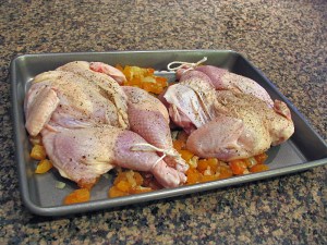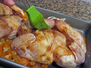 If using the clay pot, soak it for a couple of hours. If roasting in a regular pan, heat the oven to 425F. Remove hens from the refrigerator about 30 minutes prior to roasting. Rinse hens, and pat dry with a paper towel. Lightly season the cavities of the hens with salt and pepper. Spoon about 1/2 cup of stuffing into each cavity. Tie the legs closed with kitchen twine and tuck the wings under the birds. If using the clay pot, improvise a little “rack” using aluminum foil so that they don’t sit directly on the pot. Place the hens in the clay pot and place in a cold oven. Turn it to 450F. Roast for 1 hour, then open the clay pot and roast for 15 minutes longer, brushing with the glaze a couple of times.