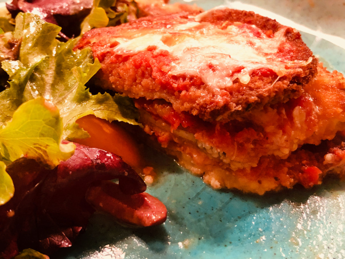 Am I breaking my own rule of never ever stating that a recipe is the best ever? Apologies for the convoluted phrase. But to answer my own question, no I am not. Because I was NOT the one who chose the name. It was published as such in Saveur magazine. You can read the interesting article clicking here. My beloved husband found it, showed it to me and said “we should probably give it a try.” Even though we alternate cooking dinner – one day he cooks, next day I do – he thinks I should be the one venturing in new territories. Which is totally fine with me. The problem with this recipe is that it will have you fry countless slices of breaded eggplant. It seemed like an ordeal and with a high chance of disappointment in the end: a heavy portion of greasy eggplant loaded with cheese. But after reading the article, I decided to humor the husband and give it a go. I tell you one thing: I was wrong. This was one OUTSTANDING eggplant parmigiana, and worth all the work.