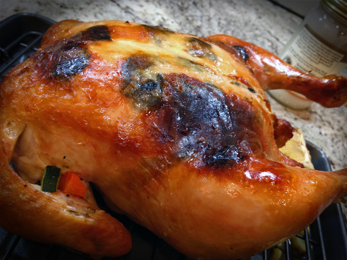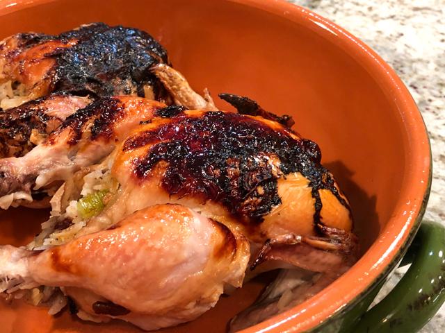 Drizzle the chicken with the remaining 2 tablespoons olive oil, and place it on the grill skin-side down. Cook for 4 to 5 minutes, rotating once or twice after a couple of minutes to get the skin crispy. (The chicken will stick to the grill at first, but it will eventually release.) When the skin side is nicely crisped, turn the chicken over, and cook for a few minutes on the other side, until it’s just cooked through.