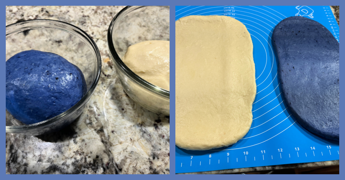 Place both dough portions in a warm spot and let them rise for approximately 2hours, or until doubled in size. Once the dough has risen, punch it down. Roll and flatten both dough portions into squares, layering the purple dough over the white dough.