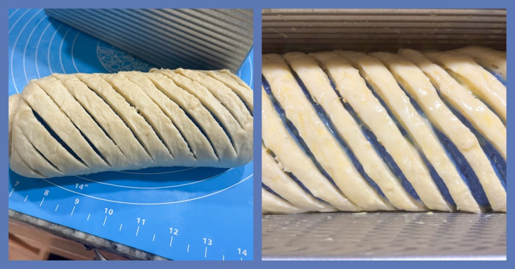 Unwrap dough and roll out into a long even rectangle. Staring from one end, roll in dough to create a swirl, making sure colored dough is inside while regular dough is facing out. Using a sharp blade or razor, score the dough evenly across the top to create “accordion” effect. Lines should be approx 1/4 inch apart and 1/8 inch deep to reveal the colored dough. Place in 450g Pullman loaf pan, cover, and let proof for 45 mins.