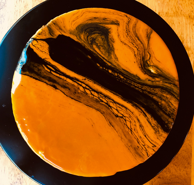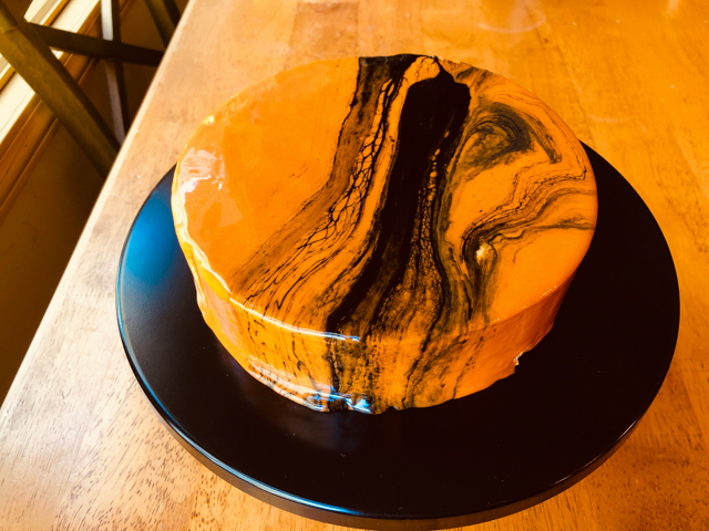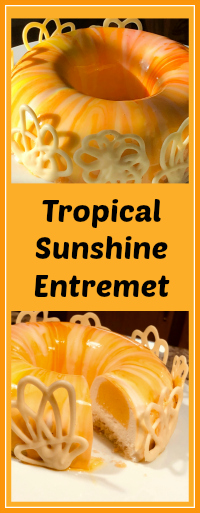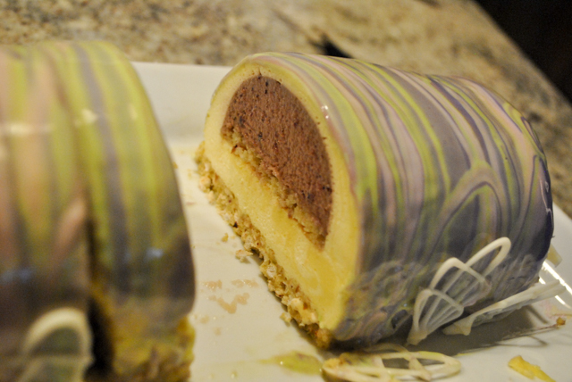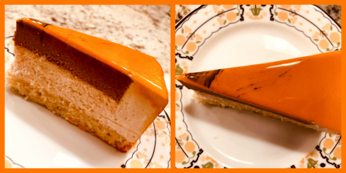 I must say that of all the entremets I’ve made, this ranks very high in the deliciousness level. The cherry, when cooked to make the center, gets a very nice texture and the taste seems concentrated. Lovely. If you make mirror glazes, I want to point out that I add a touch of agar-agar to my recipe. That makes the layer cut more nicely, without slipping, as it is common with gelatin-only formulas. There is no change in taste.