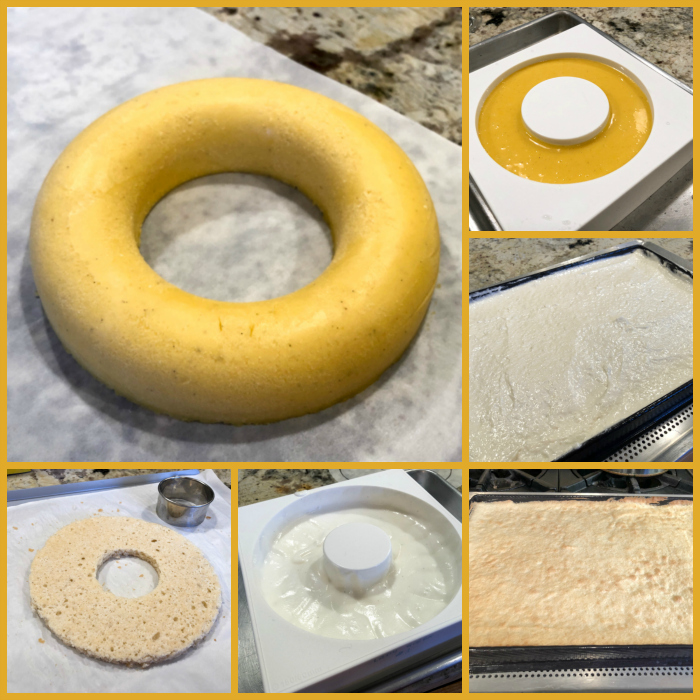 Make a meringue, gently beating the egg white until soft peaks form. Increase the speed of the mixer and add the sugar, a little bit at a time. Beat until firm peaks form. Fold one-third of the meringue into the whipped egg mixture, followed by the flour. When the mixture is smooth, gently fold in the remaining meringue. Spread the mixture on a half-sheet pan covered with parchment paper, and smooth the surface with an off-set spatula. Bake for about 10 minutes, until dry to the touch. Dust a sheet of baking paper with a little powdered sugar and invert the baked sponge over it. Peel off the parchment paper that it baked on. Using two cookie cutters, cut out 4 discs that will fit inside the mold that will hold the dessert, and 4 discs that will fit inside the little mold used for the cherry inserts. Melt the white chocolate and apply a very thin coat over one side of the larger piece of sponge. Reserve.