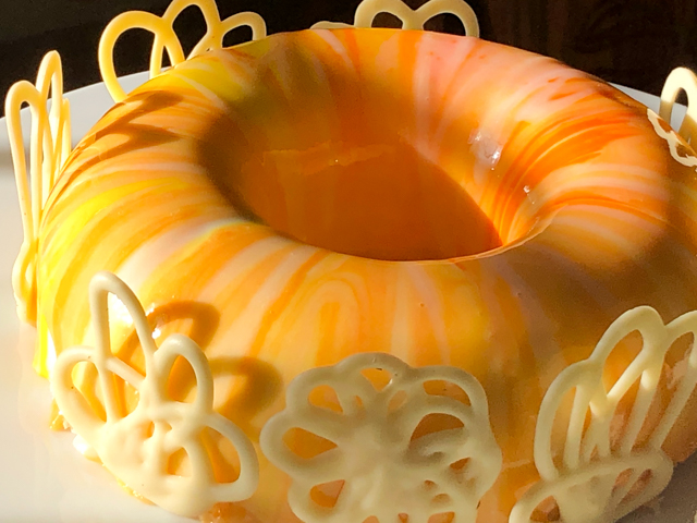 The ideal temperature to glaze is 92 to 94 F. Un-mold the cakes, immediately pour the mirror glaze over the frozen surface. Sprinkle with Prism powder or golden luster powder. Cake should sit in the fridge for a couple of hours before serving.