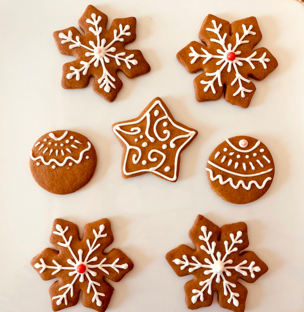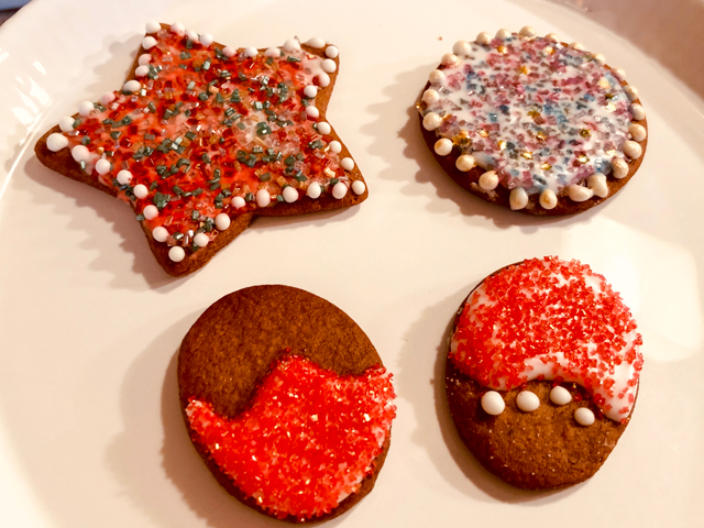 Another nice way to decorate is using the marbling technique, in which you swirl colors over a reasonably loose powdered sugar icing, and dip the surface of the cookie over it. The method is carefully detailed on my friend Helen’s blog that you can find here.
