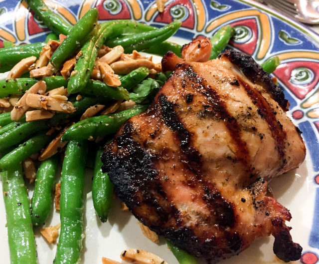 Light the grill 30 to 40 minutes before you’re ready to cook the chicken and take the chicken out of the refrigerator to let it come to room temperature. Spread the almonds on a baking sheet, and toast in the oven for 4 to 5 minutes, until they’re lightly browned and smell nutty.