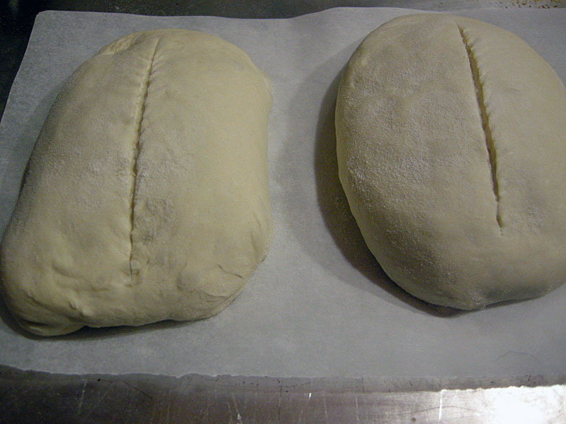 As to the shaping, I will be forever grateful to Gary, my friend and baker extraordinaire, who went through the trouble of mailing me a DVD of Chef Jeffrey Gabriel CMC, from Schoolcraft College. Gary made the video during his class on French baguettes, and I watched it over and over… and over! The main difference between Chef Gabriel’s technique and this one, is that he is not too concerned with where the seam of the baguette ends up. On my initial attempts, I was so worried about keeping the seam up for the final rise, that I ended up manipulating the baguettes too much and messed up their final shape. Gary’s method is much more user-friendly, and once you score the baguettes and bake them, the seam position seems to have no influence on the final look of the bread.