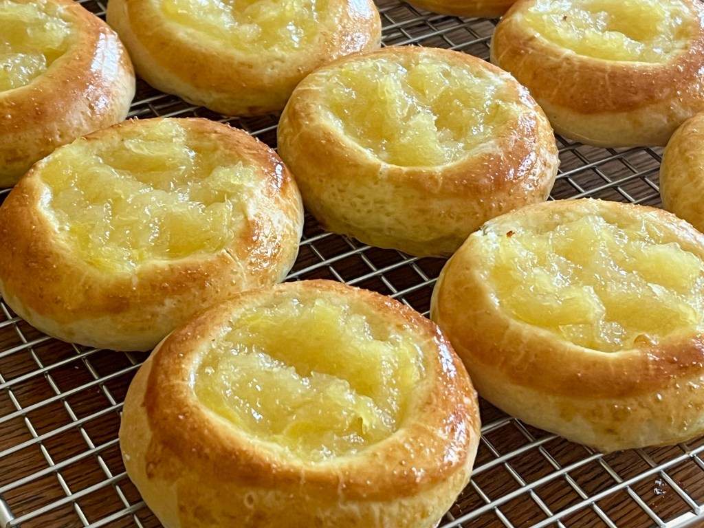 Comments: I highly recommend you visit Helen’s site to get her step-by-step photos and instructions, especially if you’ve never made enriched bread dough. The dough is very nice to work with, a bit sticky, but I urged the temptation to add more flour and all ended well in the end. I was intrigued by the pineapple filling because I rarely use pineapple in baking, but it was much better than I expected. I made the filling the day before, right after mixing the dough and placing it in the fridge for overnight proofing. Next day the whole thing was a breeze, just rolled the dough, cut circles, filled and baked. I donated them all, but sampled one for “quality control”. It was hard to stop, but I exercised herculean self-control.