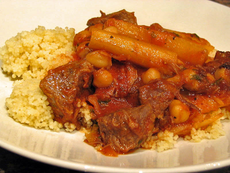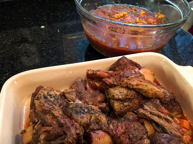 Let me just say upfront, the pictures do not do justice to how tasty this meal turned out. Ideally, this would be prepared using lamb shoulder, but it is very hard to find. So I used the upper part of the leg, boneless, tied with a net to keep its overall shape. You have two options for leg of lamb: cooking it rare to medium-rare (more traditional), or cooking a lot longer, so that the meat pretty much falls off the bone (when there’s a bone). I wanted to make it sous-vide, but while doing some research, found a wide range of temperature and cooking time listed in cookbooks and websites. After hyperventilating about it for a while, I settled on 30 hours at 160 F. I am thrilled to report that it was a successful experiment. If you don’t have a sous-vide gadget, please see my comments after the recipe.