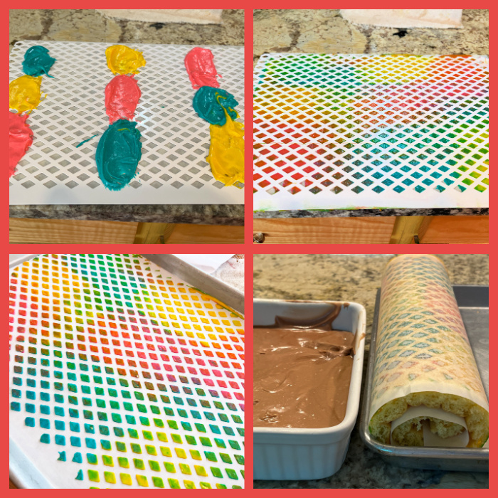 Comments: For this pattern, I used three colors of the paste, and placed them in alternating spots over the large stencil, that covers the whole surface of the half-sheet. The thickness of the stencil determines the amount of paste that gets into the paper. The design transfers very well to the surface of the cake, and does not interfere with rolling it.
