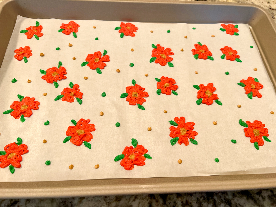 If you don’t have a stencil frame, there are plenty of alternatives to decorate, one of them drawing little flowers on the paper, and pouring the batter on top. Two things are important to remember: first, the design cannot be too large, or it will pull the cake during baking, and might even make a crack in those spots. Second, the layer of the design should be as thin as possible, because it you make it too thick, it might not incorporate well into the cake batter, and pull away during baking. Make sure to use white parchment paper, because it helps keeping the cake layer lighter, giving better contrast with whatever pattern you go for.