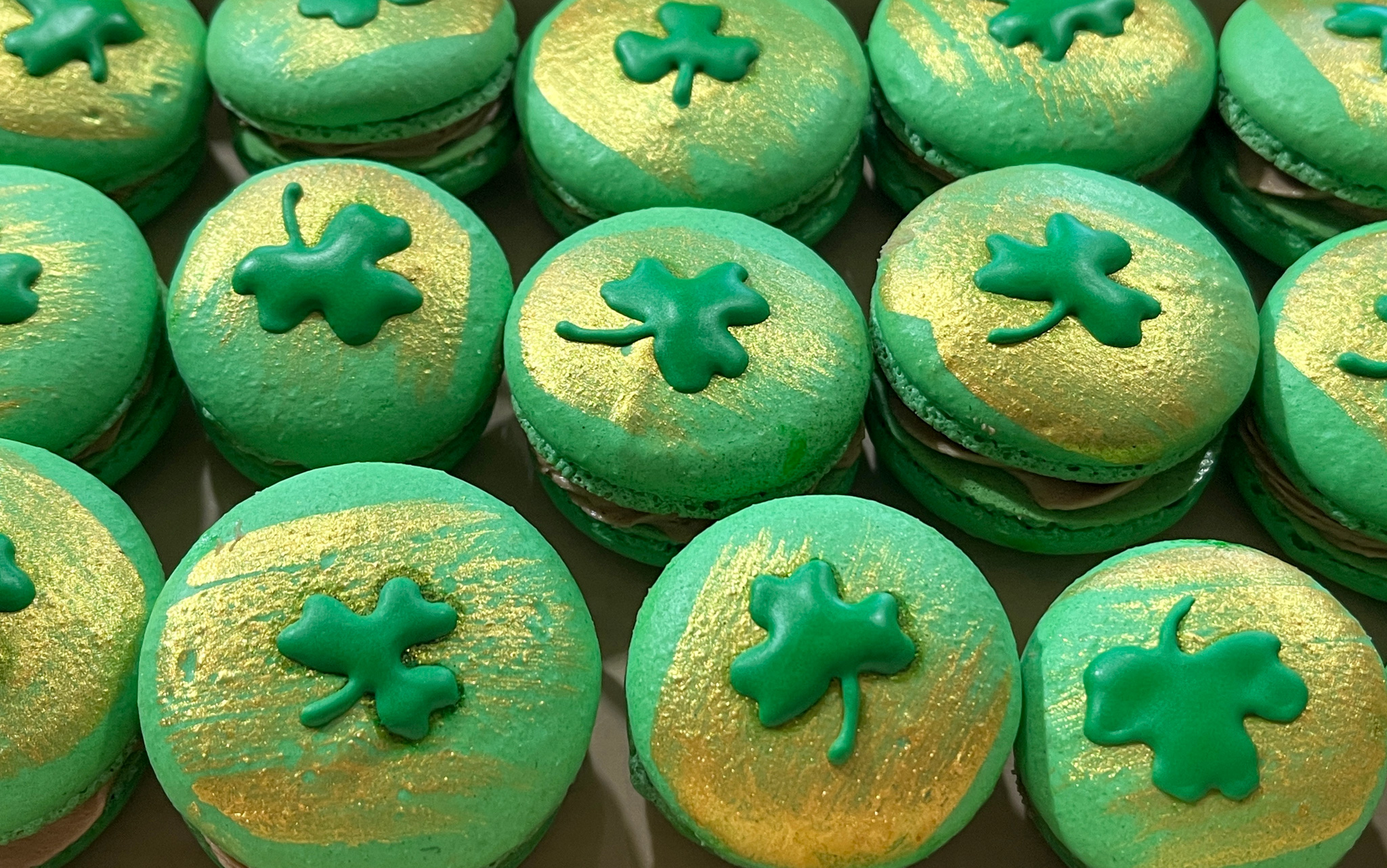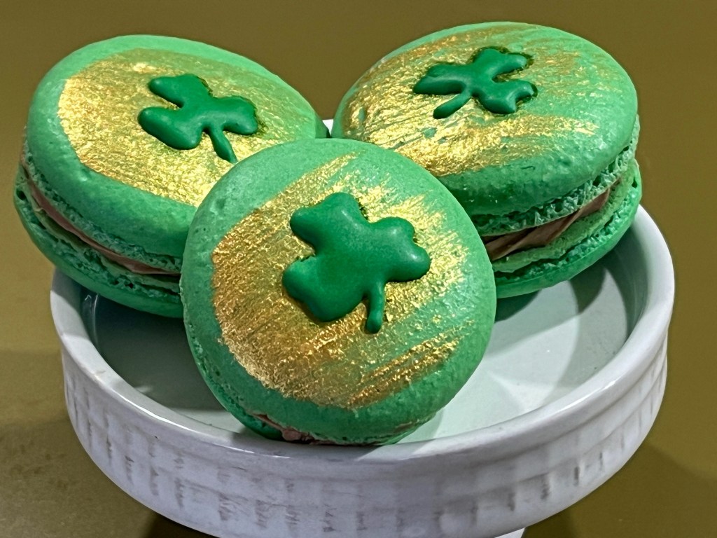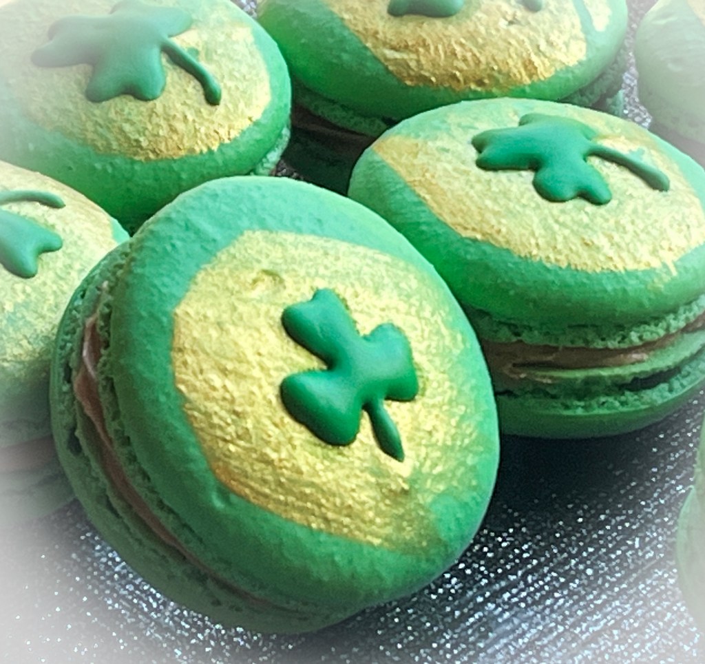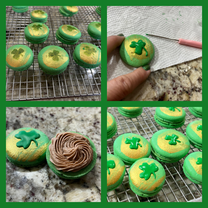 Whisk butter, powdered sugar and Nutella until light and fluffy. Adjust consistency with heavy cream, if needed. Transfer to a piping bag fitted with a open star tip. Match similar sized macaron shells with each other, fill and sandwich the cookies. Decorate the top with Royal icing in the shape of a shamrock, and if you like add a brush of gold before piping the decoration for added bling.