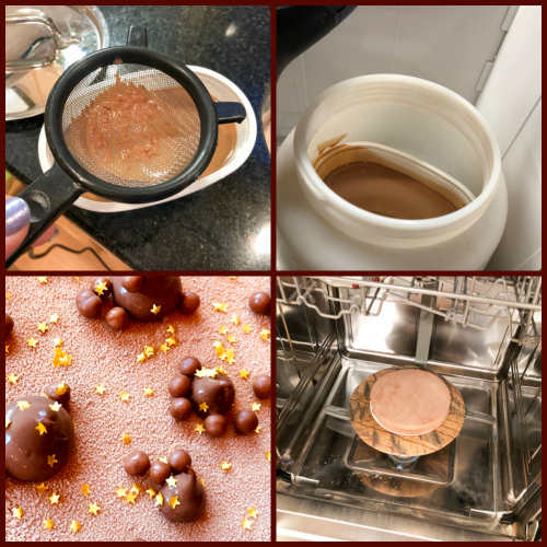 On that note, three things are worth mentioning. First, you must strain the melted chocolate + cocoa butter before pouring it in the sprayer. If you look at my photo above, you’ll notice how much stuff gets retained in the sieve. That could conceivably clog the sprayer and you don’t want that at all. Second, if you are using a regular paint sprayer for chocolate work, the container is large, so what works very well is to place a much smaller plastic cup inside, so that you don’t need to make a huge amount of chocolate suspension. I used an empty Benecol container. And third, do the spraying inside an empty dishwasher, because it is a messy process and all you need to do after is turn the dishwasher on.