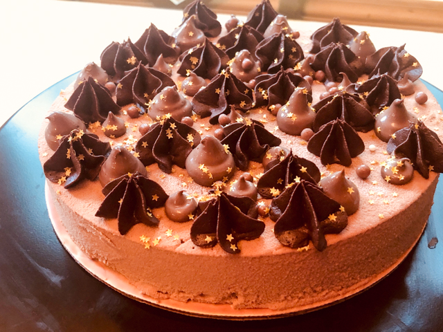 Suggested timeframe: make cookie two days before serving time and freeze it. The day before serving make the mousse, and the chocolate cream. Assemble the cake and save the cream in fridge until cake is un-molded. On serving day make the chocolate buttercream, and the chocolate spray suspension (if using).