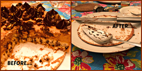 We took this cake to a dinner party at a friend’s home, so I snapped the pictures with my cell phone very quickly. I admit they are not prize-winning shots. At any rate, everybody raved about the dessert. The cookie component goes very well with the creamy mousse, and it had just the right thickness, don’t try to make it thinner because it won’t work the same way. I loved the contrast of the sharp cocoa buttercream with the milk chocolate cream and mousse, but the cake can shine with only one of the piped toppings.