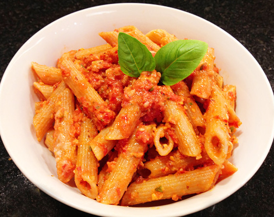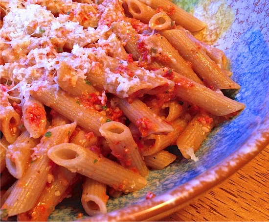 Verdict: Two very enthusiastic thumbs up for this pasta! I can understand why Paula made this dish twice in the same week. One could imagine the raw cauliflower to be too sharp and omnipresent in the pesto, but it’s not. It is just a perfectly balanced dish, with the capers, the vinegar, the sun-dried tomatoes, the parsley, a real winner. I divulged the “secret ingredient” of the Secret Recipe Club concoction to Phil, and he was amazed. The heat of the pasta slightly changes the texture of the cauliflower, taming its raw taste. I highly recommend you try this recipe. If you use the reduced amount of oil I did, make sure to save some of the pasta cooking liquid to adjust the consistency at the end. If it still seems too thick, swirl a little olive oil right at the table.