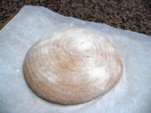 Remove the cold dough from the fridge, form into a ball, and place in a lightly floured banneton, with the seam side up. Leave at room temperature for 5 to 6 hours. Heat the oven to 450F, invert the dough on parchment paper, score the surface and place in a Dutch oven, with the lid on. Bake for 30 minutes, remove the lid and bake for further 20 to 25 minutes.