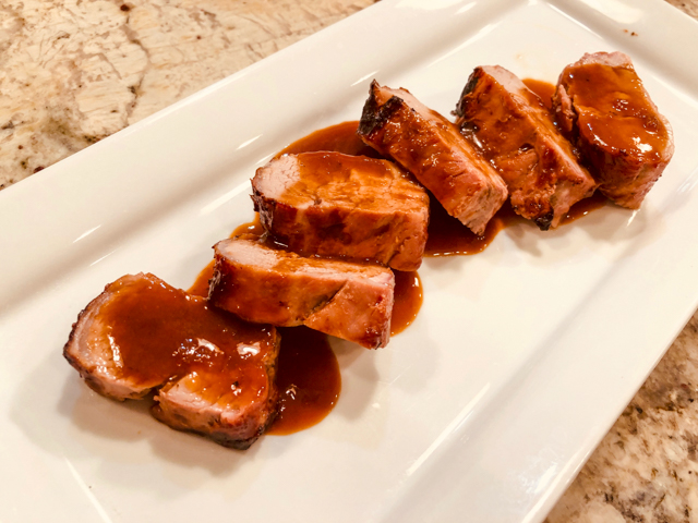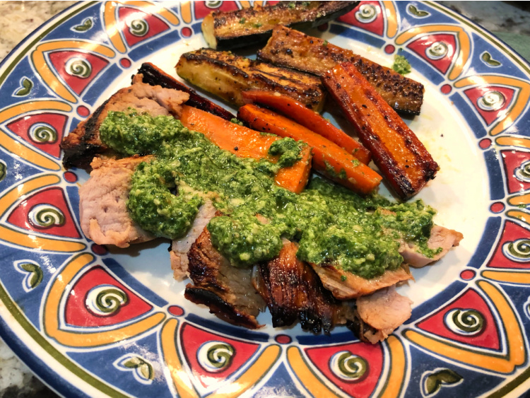 Comments: Farro takes a bit of time to cook and also I find that each new bag might behave differently. Also make sure that for this preparation you don’t buy a quick cooking version, although if might work if you simply skip the pre-cooking step. Keep in mind I have not tried it with the quick cooking kind. I normally cook farro as I cook pasta, plenty of water, then test a few grains and stop cooking when ready. In this case, I make sure it is still al dente as it will cook with everything else for 15 more minutes. If you are interested in the pork tenderloin, it is almost a non-recipe. I eye-ball a marinade whisking olive oil, soy sauce (I actually used tamari in this one), lemon juice, honey, a touch of mustard. Cut the pieces, marinade whole day in the fridge. Grill the pieces about 12 minutes total, seasoning with a little salt right before grilling. I do it all the time, sometimes with butterflied tenderloin.