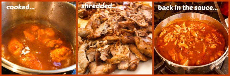 Heat a skillet over medium high heat, or if using a pressure cooker, do this step right in the pan. Sprinkle chicken on both sides evenly with paprika, salt and pepper. Drizzle olive oil into skillet or pressure cooker, when very hot add the chicken and brown on both sides. If using a pressure cooker, add half of the cooking liquid, bring to a gentle boil, close the pan and cook under pressure for 12 minutes. Release pressure under running water, reserve the meat. If the liquid does not reach halfway up the pieces of chicken, complete that volume with water.