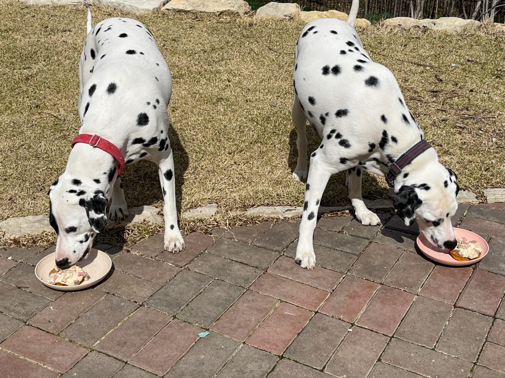Comments: This is a super easy treat to bake, and we actually tried the cake (without the frosting) and it is not bad at all! We cut three circles to offer the pups, and the leftover was cut in cubes and saved for later. Tiny Milk Bones to decorate are optional, but dog-appreciated… Our Birthday girl gave it two paws high up!