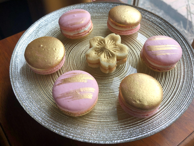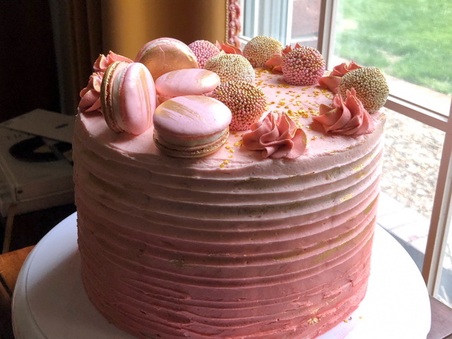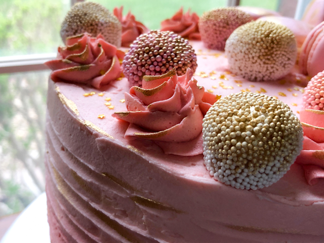 For the macarons, I painted one shell in solid gold, and added a brush of gold on the other side. I think the lemon of the macaron filling was a good match for the raspberry cake. As to the frosting, I went with a type of buttercream that stands well at room temperature for several hours. It is important to use a good quality shortening, and butter. I went with Spectrum and Kerrygold.