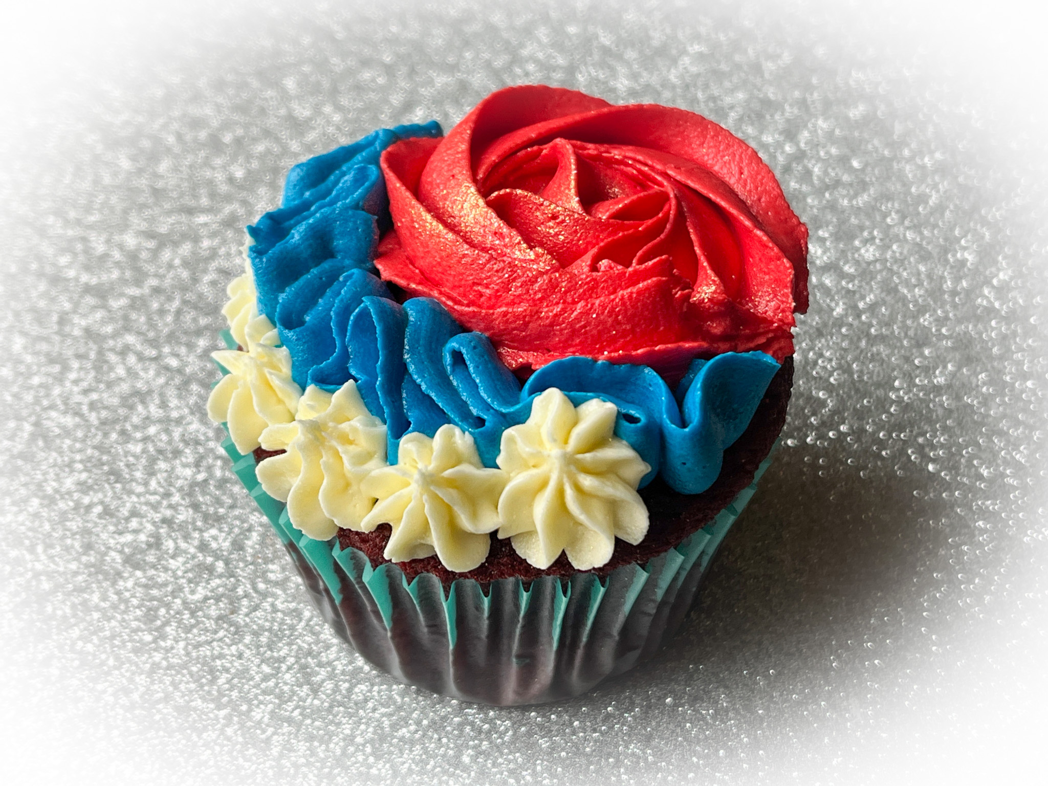 Comments: For these cupcakes I used a 1M tip for the red rose, a 102 petal tip for the blue swirl, and an open star tip 4B for the white decorations. All cupcakes were donated, so I don’t have a picture of the cake crumb but I got nice feedback about them. I think red velvet goes perfectly well for the 4th of July theme…