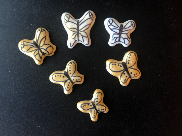 Some drawings like the butterfly are a bit too “busy” and not easy to transfer. I still think they are worth playing with, because the end result is quite striking. You need a very steady hand and be very assertive when laying the stamp on the cookie. Any hesitation and you’ll have a smudged design. If that happens, just eat the evidence when no one is looking.