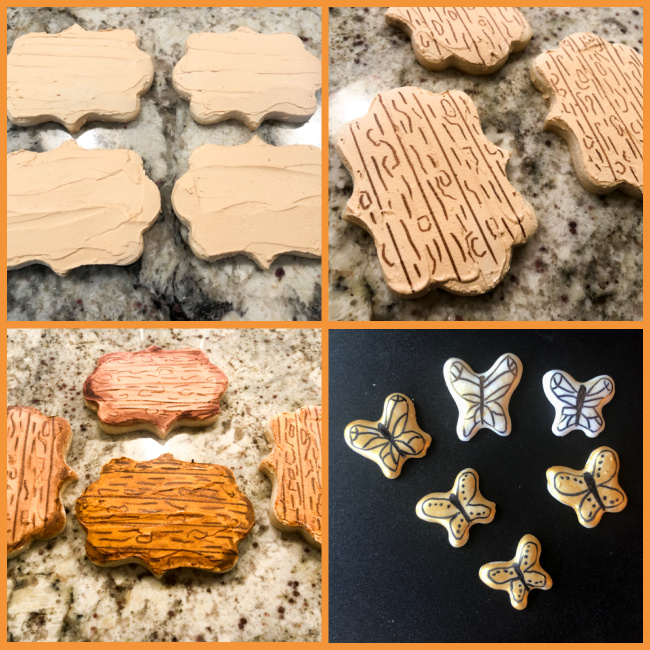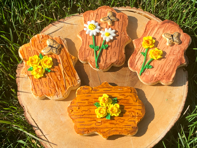 The plank is a very nice background to add to several shapes of cookies, and compatible with many different additions: birds, flowers, animals, butterflies, or even a simple monogram. And the plaque shape is also quite interesting to play with, even if you decide to go with a simple, solid color background.