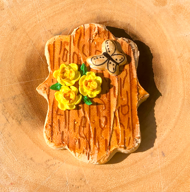 This is another stamp, also the traditional type, rubber with a wooden base. I colored the icing as before, but using a tie-dye instead of stripes. And in this design I went with colors: leaves painted with a food pen, and the little vase with gold luster powder. After painting, you might have to go back to the outline and touch it up with a fine tip black pen. Make sure the paint is fully dry, which happens quite quickly anyway.